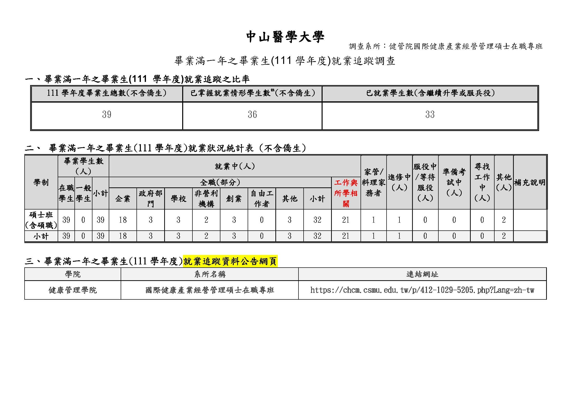 111學年度畢業滿1年畢業生流向調查